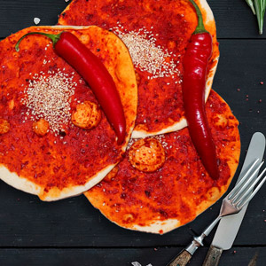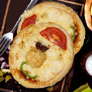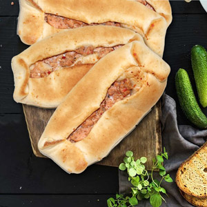Сыр "Моцарелла", помидоры, болгарский перец, сиджок (фарш из баранины, чеснок, 12 перцев).