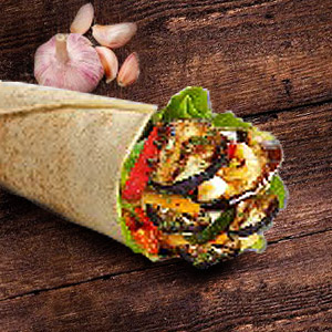 Ливанская пита, заранее обжаренные в масле кабачки, баклажаны, помидоры, перец цветной и зелень.